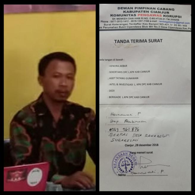 INTELMEDIA.CO, KABUPATEN CIANJUR –Ketua lembaga komunitas pengawas korupsi kpk dpc kab cianjur meminta kejaksaan negeri cianjur untuk menindak tegas para oknum lurah yang menyimpangkan angran negara yang masuk ke lembaga desa .salah satu contoh kepala desa rawabelut banyak menyimpangkan angran negara yang masuk ke desanya ,kami sebagai kontrol sosial tidak akan mendiamkan setiap temuan yang di temukan dan kami akan terus melaporkan siap temuan kami ke pihak yang berwajib .