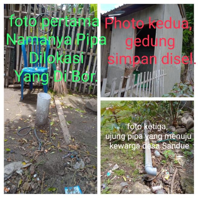 Item pekerjaan yang sudah dikerjakan sambungnya terdiri dari pengeboran air ditiga titik dengan perincian titik pertama dibelakang kantor desa Sandue yang lama, Titik kedua disekitar kantor KUD desa Sandue dan titik ketiga dipekarangan warga desa Sandue tepatnya tidak jauh dari kantor KUD desa Sandue.