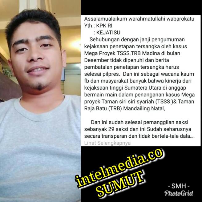Intelmedia.co SUMUT-KAB.MADINA kamis(31/01/2019) aktivis muda asal kabupaten mandailing natal (MADINA) membuat surat secara terbuka kepada KPK-RI atas buruknya kinerja kerja KEJATI-SU. yang di mana menurut aktivis muda ini kinerja kerja KEJATI-SU sangat bertele-tele atau takut untuk menetapkan TERSANGKA dalam kasus laporan masyarakat yang terjadi di madina dalam dugaan TINDAK PIDANA KORUPSI yang di lakukan oleh salah satu pejabat tertinggi di kab.Madina dalam pembangunan tempat wisata TAMAN SIRI SIRI SYARIAH DAN TAMAN RAJA BATU di kab.madina. "Saya rasa KEJATI-SU sangat bertele-tele dan tak punya nyali untuk menetapkan siapa tersangka dalam kasus ini,sampai-sampai KEJATI-SU membuat alasan untuk penetapan siapa tersangkanya setelah PILPRES 2019,saya duga di sini bang sudah jelas ada permainan.karena masak iya sih KEJATI-SU tidak berani langsung tetapkan siapa tersangkanya sedangkan proses demi proses sudah di jalani bukti-bukti sudah ada bahkan dan sudah di serahkan secara langsung bahkan juga kami sudah beberapa kali kami turun langsung demo di kejatisu" ujar Aktivis muda itu kepada wartawan intelmedia.co "saya berharap kepada KPK-RI bapak agus raharjo yang selaku ketua KPK-RI yang berada di rasunan said jakarta,Dan kepada PRESIDEN RI agar kasus TSSS & TRB di kabupaten kami ini segera di tindak lanjuti dan di tetapkan tersangkanya karena kami tidak tau lagi mau mengadu kemana lagi karena kami sudah mengadu kan kasus ini ke KEJATI-SU namun kejatisu terkesan tidak punya nyali untuk tetapkan siapa tersangkanya pada hal kami sudah kasih semua bukti-bukti penyelewengan.kami berharap kepada kpk-ri dalam kasus ini harus segera di tuntaskan" ujar rahman simanjuntak aktivis muda asal kab.madina kepada wartawan intelmedia.co